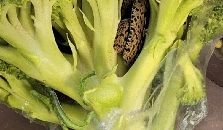 A: Wąż prawdopodobnie dostał się na pole brokułów, zaczepił się o warzywa i przypadkowo wylądował w torbie.